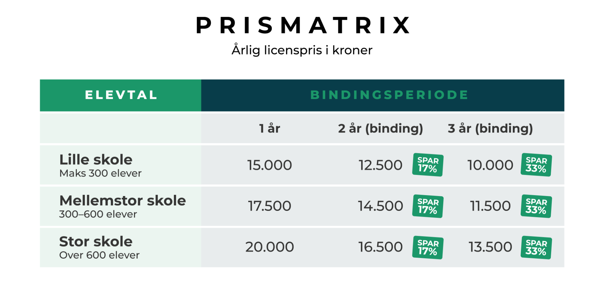 Alle licenser giver fuld adgang til ét gymnasiespil med ubegrænset brug af spillet, funktioner og deltagere.